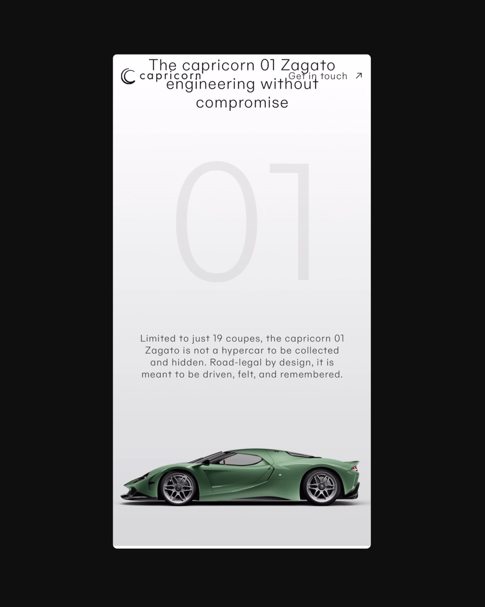 Capricorn 01 Zagato is a limited-edition hypercar born from the encounter between German engineering precision and the iconic design language of Zagato. Conceived as a rare object for collectors, the project balances technical performance with sculptural expression, positioning the vehicle as both an engineering achievement and a design statement. Numbered partnered with Capricorn to design a commercial digital platform supporting the global launch of the 01 Zagato. The website was conceived as a controlled, high-end experience—designed to inform, qualify, and engage potential buyers through a clear narrative, refined interactions, and a direct contact pathway. The result is a platform that functions as a digital showroom, aligning exclusivity with intent and enabling meaningful connections between the brand and its future owners.